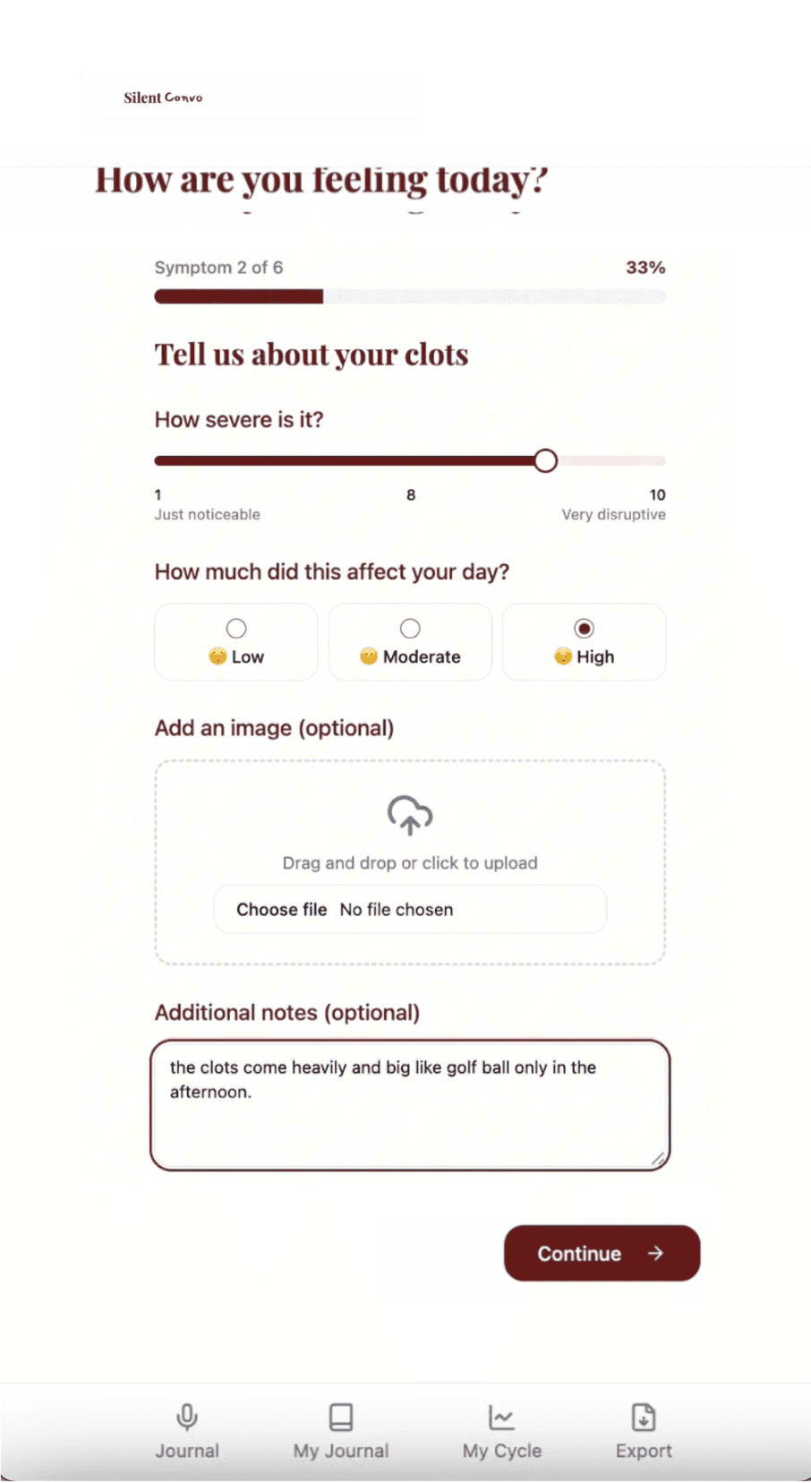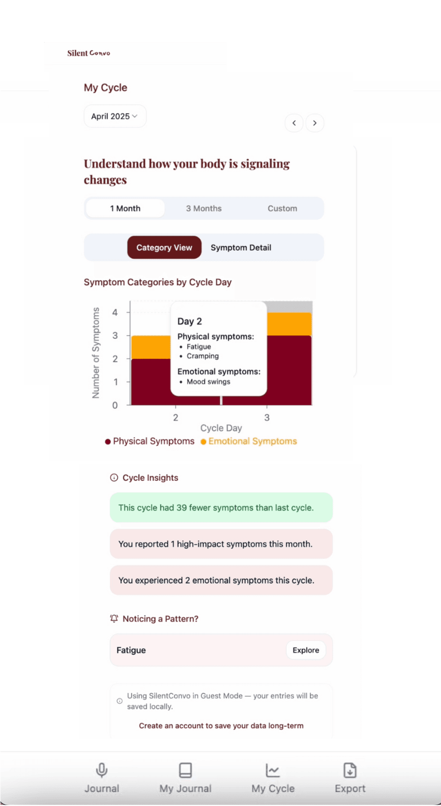In just 5 minutes, our guided conversation transforms your lived experiences into patterns you can see, understand, and act on — whether you keep them for yourself or bring them to your next appointment.